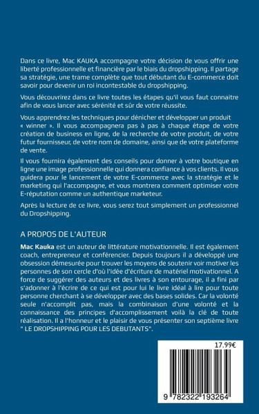 Dans ce livre, Mac KAUKA accompagne votre décision de vous offrir une liberté professionnelle et financière par le biais du dropshipping. Il partage sa stratégie, une trame complète que tout débutant du E-commerce doit savoir pour devenir un roi incontestable du dropshipping.