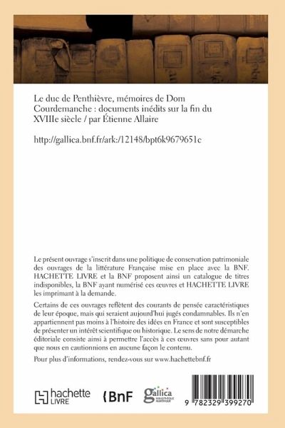 Le duc de Penthièvre, mémoires de Dom Courdemanche: documents inédits sur la fin du XVIIIe siècle / par Étienne Allaire Date de l'édition originale: 1889 Le présent ouvrage s'inscrit dans une politique de conservation patrimoniale des ouvrages de la littérature Française mise en place avec la BNF. HACHETTE LIVRE et la BNF proposent ainsi un catalogue de titres indisponibles, la BNF ayant numérisé ces oeuvres et HACHETTE LIVRE les imprimant à la demande. Certains de ces ouvrages reflètent des courants de pensée caractéristiques de leur époque, mais qui seraient aujourd'hui jugés condamnables. Ils n'en appartiennent pas moins à l'histoire des idées en France et sont susceptibles de présenter un intérêt scientifique ou historique. Le sens de notre démarche éditoriale consiste ainsi à permettre l'accès à ces oeuvres sans pour autant que nous en cautionnions en aucune façon le contenu. Pour plus d'informations, rendez-vous sur www.hachettebnf.fr