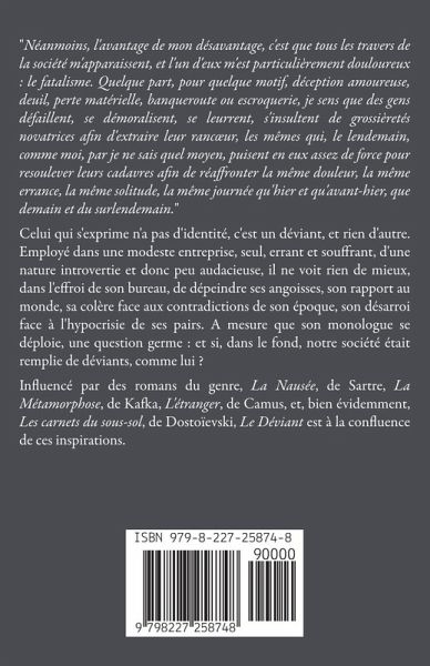 "Néanmoins, l'avantage de mon désavantage, c'est que tous les travers de la société m'apparaissent, et l'un d'eux m'est particulièrement douloureux : le fatalisme. Quelque part, pour quelque motif, déception amoureuse, deuil, perte matérielle, banqueroute ou escroquerie, je sens que des gens défaillent, se démoralisent, se leurrent, s'insultent de grossièretés novatrices afin d'extraire leur rancur, les mêmes qui, le lendemain, comme moi, par je ne sais quel moyen, puisent en eux assez de force pour resoulever leurs cadavres afin de réaffronter la même douleur, la même errance, la même solitude, la même journée qu'hier et qu'avant-hier, que demain et du surlendemain." Celui qui s'exprime n'a pas d'identité, c'est un déviant, et rien d'autre. Employé dans une modeste entreprise, seul, errant et souffrant, d'une nature introvertie et donc peu audacieuse, il ne voit rien de mieux, dans l'effroi de son bureau, de dépeindre ses angoisses, son rapport au monde, sa colère face aux contradictions de son époque, son désarroi face à l'hypocrisie de ses pairs. A mesure que son monologue se déploie, une question germe : et si, dans le fond, notre société était remplie de déviants, comme lui ? Influencé par des romans du genre, La Nausée, de Sartre, La Métamorphose, de Kafka, L'étranger, de Camus, et, bien évidemment, Les carnets du sous-sol, de Dostoïevski, Le Déviant est à la confluence de ces inspirations.