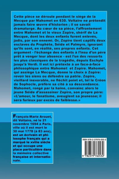 Cette pièce se déroule pendant le siège de la Mecque par Mahomet en 630. Voltaire ne prétendit jamais faire œuvre d’historien ; il se savait dramaturge. Au cœur de sa pièce, l’affrontement entre Mahomet et le vieux Zopire, shérif de La Mecque, dont les deux enfants furent enlevés, jadis, par son ennemi. Or, Zopire tient captifs deux esclaves du Prophète, Séide et Palmyre, ignorant qu’ils sont, en réalité, ses propres enfants. Cet argument - l’échange des enfants à l’insu d’un père prêt à venger leur absence - est l’un des ressorts les plus classiques de la tragédie, depuis Eschyle jusqu’à Verdi. Il est ici prétexte à un face-à-face philosophique entre Mahomet et Zopire. Mahomet, qui assiège La Mecque, donne le choix à Zopire: revoir les siens ou défendre sa patrie. Zopire, vieillard inexorable, ne fléchit point et, tel le Créon de Sophocle, préfère sa cité à sa descendance. Mahomet, rongé par la haine, convainc alors le jeune Séide d’assassiner Zopire, son propre père: «L’amour, le fanatisme, aveuglent sa jeunesse; il sera furieux par excès de faiblesse.»