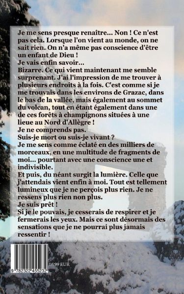 Je me sens presque renaître... Non ! Ce n'est pas cela. Lorsque l'on vient au monde, on ne sait rien. On n'a même pas conscience d'être un enfant de Dieu !Je vais enfin savoir...Bizarre. Ce qui vient maintenant me semble surprenant. J'ai l'impression de me trouver à plusieurs endroits à la fois. C'est comme si je me trouvais dans les environs de Grazac, dans le bas de la vallée, mais également au sommet du volcan, tout en étant également dans une de ces forêts à champignons situées à une lieue au Nord d'Allègre !Je ne comprends pas. Suis-je mort ou suis-je vivant ?Je me sens comme éclaté en des milliers de morceaux, en une multitude de fragments de moi... pourtant avec une conscience une et indivisible.Et puis, du néant surgit la lumière. Celle que j'attendais vient enfin à moi. Tout est tellement lumineux que je ne perçois plus rien. Je ne ressens plus rien non plus.Je suis prêt !Si je le pouvais, je cesserais de respirer et je fermerais les yeux. Mais ce sont désormais des sensations que je ne pourrai plus jamais ressentir !