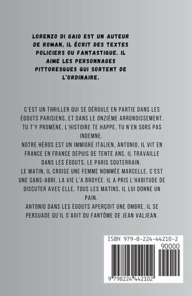 Ce texte peut être considéré comme une ¿uvre fantastique, un polar ou un conte de fée. Pourquoi, tout dépend de notre grille de lecture. Un roman social, ou un mélodrame sans musique. C'est un drame au ton populaire où s'accumulent des péripéties que personne n'attend. C'est un thriller moderne, le suspense surprendra le lecteur. Antonio est un immigré italien, il est arrivé en France voilà 30, il a une cinquantaine d'années. Il est originaire du mezzo, c'est le sud de l'Italie. Il lui manque, son c¿ur est toujours là-bas, la France ce n'est pas un choix, mais une nécessité. Il vit dans la banlieue parisienne, à Montreuil, en Seine-Saint-Denis. Il travaille au service des égouts de la ville de Paris, des contrats de travail à durée déterminée de six mois, il ne les compte plus. Depuis 20 ans, il a franchi le cap des quarante contrats. C'est un héros malgré lui, il n'en a pas l'étoffe, ce n'est un individu sans c¿ur, il dévoile de l'empathie envers ceux qui n'ont rien. Ce n'est pas un mec musclé sans cervelle. Tous les matins, il se rend à Paris en métro, dans le onzième arrondissement de Paris. Paris historique lui ouvre les portes. Le faubourg Saint-Antoine, la place de la Bastille, la petite et la grande Roquette et le boulevard de Ménilmontant appartiennent au monde, ces lieux sont rattachés à l'histoire. La prise de la Bastille symbolise la chute de l'arbitraire, la déclaration Universelle des droits de l'homme. N'importe où qu'il aille, le passé lui cligne de l'¿il, d'autres noms poursuivent l'émerveillement, le cimetière du père Lachaise, Beaubourg, le marais. Ce sont des endroits emblématiques de la capitale. Mais le récit se déroule sous terre. C'est la ville souterraine sans Paris, des cafards, des rats, des mauvaises odeurs, le soleil est absent, une lumière blafarde illumine les murs. Jean Valjean l'a traversé. Ici, on n'évoque pas la piétonisation de la capitale. Au lever du soleil, au square de la Roquette, il rencontre une personne sans-abri, c'est une femme, elle s'appelle Marcelle. La vie au travers de la rue a fané son éclat, c'est une fleur qui a perdu sa beauté. Son visage terne et sans rire engendre la pitié. Il discute avec elle au sujet du temps qui passe. Il dépose un pain à côté d'elle sans dire un mot, et il s'en va. Son travail consiste à surveiller, réparer les canalisations, il en l'entretien des égouts, la mauvaise odeur l'incommode, le soir, il prend l'air, il respire. L'air parisien lui permet de chasser les mauvaises odeurs de cette ville souterraine. Il parle de gouffre, chaque fois qu'il descend. Un jour, il aperçoit, une ombre, il se persuade qu'il s'agit du fantôme de Jean Valjean, Victor Hugo a écrit qu'il était maire de Montreuil. L'ombre traine une patte, Jean Valjean aussi.