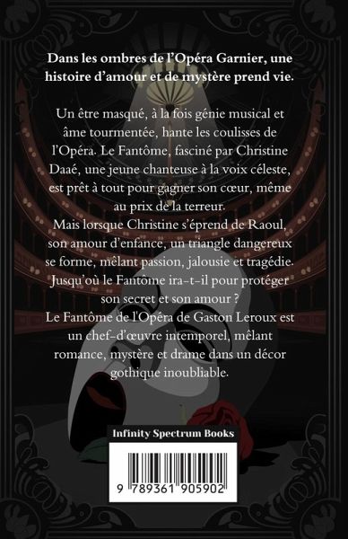 Un chef-d'uvre intemporel de mystère, de passion et de tragédie Sous les voûtes majestueuses de l'Opéra Garnier, un secret sombre plane. Une ombre masquée, connue sous le nom de Fantôme, dicte sa loi dans un monde où la musique sublime côtoie la terreur. Lorsque Christine Daaé, une jeune chanteuse à la voix enchanteresse, devient la muse du Fantôme, elle se retrouve piégée entre son pouvoir hypnotique et l'amour sincère de Raoul, son ami d'enfance. Mais à quel prix peut-on satisfaire les désirs d'un cur brisé ? Dans ce roman captivant, Gaston Leroux tisse une histoire où l'amour et l'obsession s'affrontent, où les apparences cachent des vérités déchirantes, et où le destin des personnages est suspendu à un fil. Le Fantôme de l'Opéra vous transporte dans un univers de mystère gothique, de splendeur musicale et d'émotions intenses. Découvrez l'histoire qui a inspiré des générations et continue de captiver les âmes. Osez entrer dans l'univers du Fantôme... si vous en avez le courage.