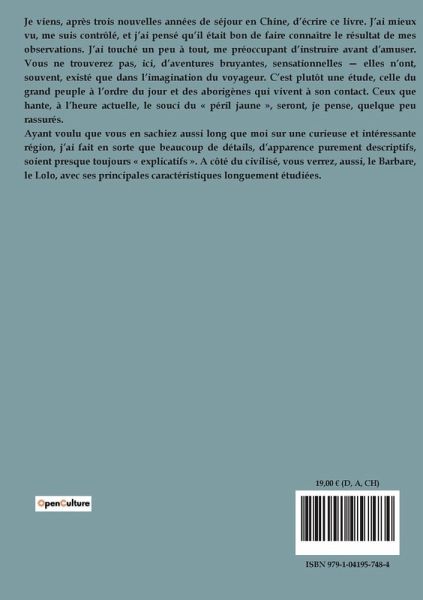 Je viens, après trois nouvelles années de séjour en Chine, d¿écrire ce livre. J¿ai mieux vu, me suis contrôlé, et j¿ai pensé qüil était bon de faire connaître le résultat de mes observations. J¿ai touché un peu à tout, me préoccupant d¿instruire avant d¿amuser. Vous ne trouverez pas, ici, d¿aventures bruyantes, sensationnelles ¿ elles n¿ont, souvent, existé que dans l¿imagination du voyageur. C¿est plutôt une étude, celle du grand peuple à l¿ordre du jour et des aborigènes qui vivent à son contact. Ceux que hante, à l¿heure actuelle, le souci du « péril jaune », seront, je pense, quelque peu rassurés. Ayant voulu que vous en sachiez aussi long que moi sur une curieuse et intéressante région, j¿ai fait en sorte que beaucoup de détails, d¿apparence purement descriptifs, soient presque toujours « explicatifs ». A côté du civilisé, vous verrez, aussi, le Barbare, le Lolo, avec ses principales caractéristiques longuement étudiées.