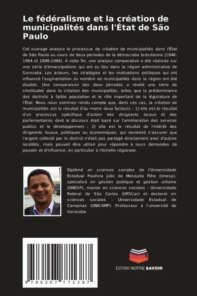 Cet ouvrage analyse le processus de création de municipalités dans l'État de São Paulo au cours de deux périodes de la démocratie brésilienne (1946-1964 et 1988-1996). À cette fin, une analyse comparative a été réalisée sur une série d'émancipations qui ont eu lieu dans la région administrative de Sorocaba. Les acteurs, les stratégies et les motivations politiques qui ont influencé l'augmentation du nombre de municipalités dans la région ont été étudiés. Une comparaison des deux périodes a révélé une série de similitudes dans la création des municipalités, telles que la prédominance des districts à faible population et le rôle important de la législature de l'État. Nous nous sommes rendu compte que, dans ces cas, la création de municipalités est le résultat d'au moins deux facteurs : 1) elle est le résultat d'un processus spécifique d'action des dirigeants locaux et des parlementaires dont le discours était basé sur l'amélioration des services publics et le développement ; 2) elle est le résultat de l'intérêt des dirigeants locaux, politiques ou économiques, qui voulaient s'assurer que l'argent collecté par le district n'était pas partagé directement avec d'autres localités, mais pouvait être utilisé pour répondre à leurs demandes de pouvoir et d'influence, en particulier à l'échelle régionale.