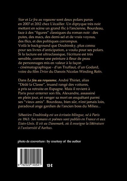 "Star" et "Le feu au royaume" sont deux polars parus en 2007 et 2012 chez L'écailler. Un diptyque très noir mettant en scène un grand flic "à l'ancienne", Bourdeau, face à des figures classiques du roman noir, autrement dit des putes, des macs, des demi-sel et de vrais voyous, des flics, des politiques corrompus. Voilà le background que Doubinsky, plus connu pour ses livres d'anticipation, a voulu pour ses polars. Si la facture est ultraclassique, l'écriture est très sensible, comme une peinture à fleur de peau de personnages mis en valeur à la façon - cinématographique - d'un Truffaut ou d'un Godard, voire du film "Drive" du Danois Nicolas Winding Refn.
