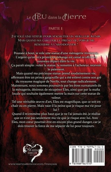 J'ai volé une statue pour m'acheter un meilleur avenir. Mais quand ma gargouille prend vie, puis-je me résoudre à l'abandonner ? Poussée à bout, je vole une statue d'une ménagerie itinérante. L'argent qu'on m'a promis en échange est censé m'offrir un nouveau départ dans la vie. Ça paraît simple : voler la statue, la remettre à l'acheteur, recevoir le paiement. Mais quand ma précieuse statue prend soudainement vie, affirmant être un prince gargouille qui a été enlevé contre son gré du royaume magique de Nerifir, tout change radicalement. Maintenant, nous sommes poursuivis par les êtres surnaturels de la ménagerie, désireux de récupérer Elex, ainsi que par la mafia locale qui souhaite également mettre la main sur cette statue de valeur. Tel une véritable uvre d'art, Elex est magnifique, que ce soit en chair ou en pierre. Mais vaut-il la peine que je risque ma vie pour lui ? Quand il m'emmène plus haut que je ne l'ai jamais été, je réalise que ce n'est pas seulement ma vie que je risque avec lui. Avec Elex, mon cur pourrait être en encore plus grand danger, car je dois trouver la force de me séparer de lui pour toujours. ____________________ Ce livre est le premier tome de la collection Le Feu dans la Pierre, qui se déroule dans le monde de Marina Simcoe : la Rivière des Brumes. Il se termine par une fin heureuse, mais l'histoire des personnages principaux se poursuit dans le second tome, Curs en Feu. ____________________ Le Monde de la Rivière des Brumes Le Feu dans la Pierre Curs en Feu * * * La Caresse du Serpent La Conquête du Serpent * * * L'appel de l'Eau Folie de la Lune Le Puissance de la Rage