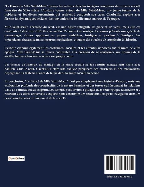 Un mariage arrangé peut-il résister aux tumultes du cur? Dans ' Le Fiancé de Mlle Saintmaur ', Victor Cherbuliez nous transporte dans la société bourgeoise du XIXe siècle, où les conventions sociales et les aspirations personnelles s'affrontent. L'histoire se déroule dans un cadre où les apparences et les alliances familiales dictent souvent le cours des vies. Mlle Saintmaur, une jeune femme de caractère, se retrouve au centre d'un dilemme entre un mariage de convenance et les élans de son cur. À travers une analyse fine des murs de l'époque, Cherbuliez explore les thèmes de l'amour, du devoir et de l'indépendance. Le lecteur est invité à suivre les péripéties de Mlle Saintmaur, dont le parcours est jalonné de choix difficiles et de rencontres inattendues. Ce roman psychologique met en lumière les tensions entre les désirs individuels et les attentes collectives, offrant un regard pénétrant sur les changements familiaux et sociaux. En développant des personnages complexes et des situations intrigantes, ce livre nous apprend à mieux comprendre les enjeux émotionnels et sociaux qui traversent les relations humaines. Par une narration habile et des dialogues fluides, nous percevons désormais mieux les subtilités des interactions sociales et les défis de l'émancipation personnelle.