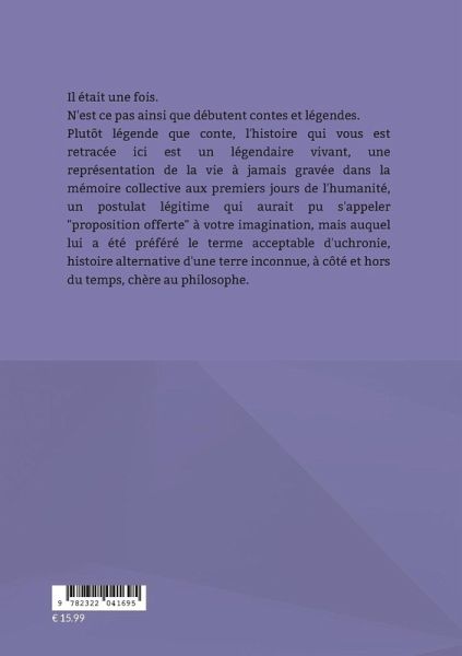 Il était une fois.N'est ce pas ainsi que débutent contes et légendes.Plutôt légende que conte, l'histoire qui vous est retracée ici est un légendaire vivant, une représentation de la vie à jamais gravée dans la mémoire collective aux premiers jours de l'humanité, un postulat légitime qui aurait pu s'appeler "proposition offerte" à votre imagination, mais auquel lui a été préféré le terme acceptable d'uchronie, histoire alternative d'une terre inconnue, à côté et hors du temps, chère au philosophe.