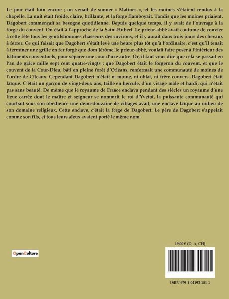 Le jour était loin encore ; on venait de sonner « Matines », et les moines s¿étaient rendus à la chapelle. La nuit était froide, claire, brillante, et la forge flamboyait. Tandis que les moines priaient, Dagobert commençait sa besogne quotidienne. Depuis quelque temps, il y avait de l¿ouvrage à la forge du couvent. On était à l¿approche de la Saint-Hubert. Le prieur-abbé avait coutume de convier à cette fête tous les gentilshommes chasseurs des environs, et il y aurait dans trois jours des chevaux à ferrer. Ce qui faisait que Dagobert s¿était levé une heure plus tôt qüà l¿ordinaire, c¿est qüil tenait à terminer une grille en fer forgé que dom Jérôme, le prieur-abbé, voulait faire poser à l¿intérieur des bâtiments conventuels, pour séparer une cour d¿une autre. Or, il faut vous dire que cela se passait en l¿an de grâce mille sept cent quatre-vingts ; que Dagobert était le forgeron du couvent, et que le couvent de la Cour-Dieu, bâti en pleine forêt d¿Orléans, renfermait une communauté de moines de l¿ordre de Cîteaux. Cependant Dagobert n¿était ni moine, ni oblat, ni frère convers. Dagobert était laïque. C¿était un garçon de vingt-deux ans, taillé en hercule, d¿un visage mâle et hardi, qui n¿était pas sans beauté. De même que le royaume de France enclava pendant des siècles un royaume d¿une lieue carrée dont le maître et seigneur se nommait le roi d¿Yvetot, la puissante communauté qui courbait sous son obédience une demi-douzaine de villages avait, une enclave laïque au milieu de son domaine religieux. Cette enclave, c¿était la forge de Dagobert. Le père de Dagobert s¿appelait comme son fils, et tous leurs aïeux avaient porté le même nom.