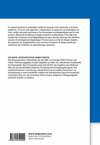 Ce manuel présente la variété du français nord-américain la plus importante, le français québécois. En utilisant une approche variationniste, cette variété est exposée dans toute sa dynamique sociolinguistique et en tant que variété nationale autonome. Le livre tient compte des évolutions (socio)linguistiques plus récentes et des dernières mesures en aménagement linguistique. De plus, il comporte de nombreux exemples linguistiques actuels et authentiques.