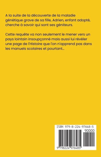 A la suite de la découverte de la maladie génétique grave de sa fille, Adrien, enfant adopté, cherche à savoir qui sont ses géniteurs. Cette requête va non seulement le mener vers un pays lointain insoupçonné mais aussi lui révéler une page de l'Histoire que l'on n'apprend pas dans les manuels scolaires et pourtant...