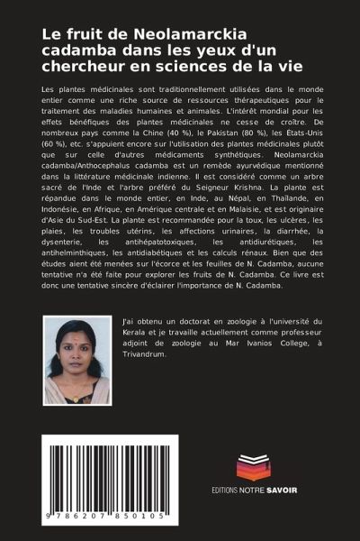 Les plantes médicinales sont traditionnellement utilisées dans le monde entier comme une riche source de ressources thérapeutiques pour le traitement des maladies humaines et animales. L'intérêt mondial pour les effets bénéfiques des plantes médicinales ne cesse de croître. De nombreux pays comme la Chine (40 %), le Pakistan (80 %), les États-Unis (60 %), etc. s'appuient encore sur l'utilisation des plantes médicinales plutôt que sur celle d'autres médicaments synthétiques. Neolamarckia cadamba/Anthocephalus cadamba est un remède ayurvédique mentionné dans la littérature médicinale indienne. Il est considéré comme un arbre sacré de l'Inde et l'arbre préféré du Seigneur Krishna. La plante est répandue dans le monde entier, en Inde, au Népal, en Thaïlande, en Indonésie, en Afrique, en Amérique centrale et en Malaisie, et est originaire d'Asie du Sud-Est. La plante est recommandée pour la toux, les ulcères, les plaies, les troubles utérins, les affections urinaires, la diarrhée, la dysenterie, les antihépatotoxiques, les antidiurétiques, les antihelminthiques, les antidiabétiques et les calculs rénaux. Bien que des études aient été menées sur l'écorce et les feuilles de N. Cadamba, aucune tentative n'a été faite pour explorer les fruits de N. Cadamba. Ce livre est donc une tentative sincère d'éclairer l'importance de N. Cadamba.