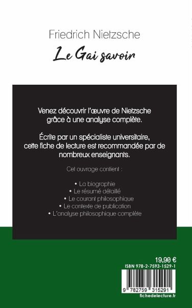 Venez découvrir Le Gai savoir de Nietzsche grâce à une analyse philosophique de référence ! Écrite par un spécialiste universitaire, cette fiche de lecture est recommandée par de nombreux enseignants. Cet ouvrage contient la biographie du philosophe, le résumé détaillé, le courant philosophique, le contexte de publication de l'oeuvre et l'analyse complète. Retrouvez tous nos titres sur : www.fichedelecture.fr.