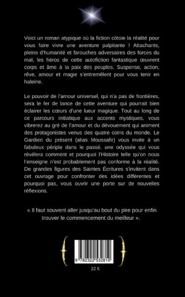 Voici un roman atypique où la fiction côtoie la réalité pour vous faire vivre une aventure palpitante ! Attachants, plein d'humanité et farouches adversaires des forces du mal, les héros de cette autofiction fantastique oeuvrent corps et âme à la paix des peuples. Suspens, action, rêve, amour et magie s'entremêlent pour vous tenir en haleine. Le pouvoir de l'amour universel, qui n'a pas de frontière, sera le fer de lance de cette aventure qui pourrait bien éclairer les coeurs d'une lueur magique. Tout au long de ce parcours initiatique aux accents mystiques, vous vibrerez au gré de l'amour et du dévouement qui animent des protagonistes venus des quatre coins du monde. Le gardien du présent (alias Moussafir) vous invite à un fabuleux périple dans le passé, une odyssée qui vous révèlera comment et pourquoi l'Histoire telle qu'on nous l'enseigne n'est probablement pas conforme à la réalité. De grandes figures des Saintes Ecritures s'invitent dans cet ouvrage pour confronter des idées et pourquoi pas, vous ouvrir une porte vers de nouvelles réflexions.
