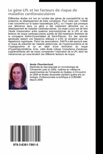 Différentes études ont mis en lumière des gènes de susceptibilité ou de protection au développement de traits complexes. Pour notre part, l intérêt s est concentré sur la lipase lipoprotéique (LPL), où l impact que provoque une déficience dans ce gène a été clairement démontré sur le développement de maladies cardiovasculaires. Ce projet a pour but de faire l étude d association entre quatorze polymorphismes de la LPL et des facteurs de risque cardiovasculaires auprès de 252 travailleurs forestiers de la compagnie Abitibi-Consolidated de Saint-Félicien. Six des variants génotypés avaient une fréquence allélique 2,5% et servaient pour les régressions logistiques. Parmi les associations, S447X a été associé avec le risque de présenter de l obésité abdominale, de l hyperinsulinémie et de l hyperglycémie et ce en dépit d une diminution du risque d hypertriglycéridémie. Ainsi, cette étude indique l importance d analyses supplémentaires afin de mieux comprendre l implication de la LPL dans les mécanismes qui sous-tendent ces différents facteurs de risque.