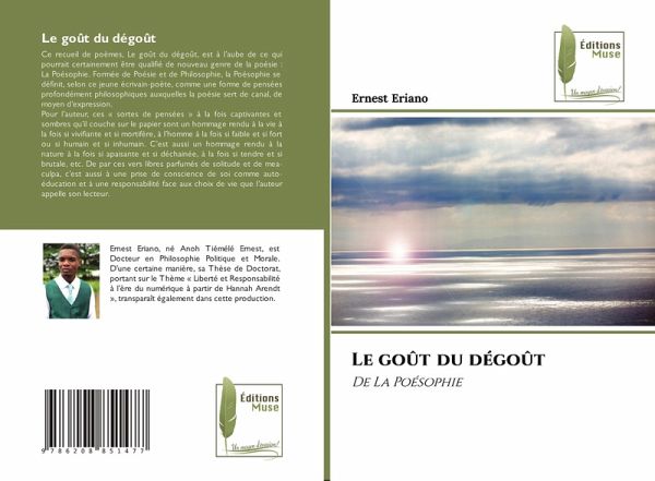 Ce recueil de poèmes, Le goût du dégoût, est à l'aube de ce qui pourrait certainement être qualifié de nouveau genre de la poésie : La Poésophie. Formée de Poésie et de Philosophie, la Poésophie se définit, selon ce jeune écrivain-poète, comme une forme de pensées profondément philosophiques auxquelles la poésie sert de canal, de moyen d'expression.Pour l'auteur, ces « sortes de pensées » à la fois captivantes et sombres qu'il couche sur le papier sont un hommage rendu à la vie à la fois si vivifiante et si mortifère, à l'homme à la fois si faible et si fort ou si humain et si inhumain. C'est aussi un hommage rendu à la nature à la fois si apaisante et si déchainée, à la fois si tendre et si brutale, etc. De par ces vers libres parfumés de solitude et de mea-culpa, c'est aussi à une prise de conscience de soi comme auto-éducation et à une responsabilité face aux choix de vie que l'auteur appelle son lecteur.