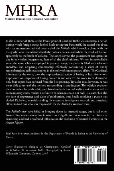 This satirical poem, known popularly as the Miliade because of its thousand-verse length (in octosyllabic verse), was printed anonymously around 1636. The poem's endurance and plentiful and specific political references make it a lively commentary encompassing discontent with the increasingly centralized government before the outbreak of the civil wars, the Frondes (1648-53).
