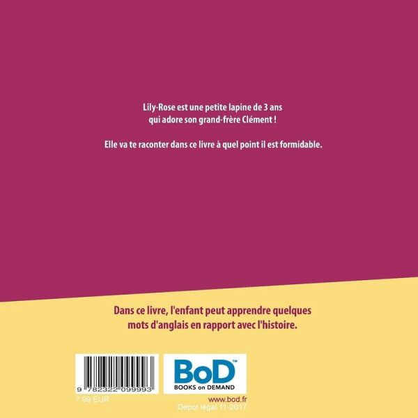 Lily-Rose est une petite lapine de 3 ans qui adore son grand-frère Clément. Elle va te raconter dans ce livre à quel point il est formidable.