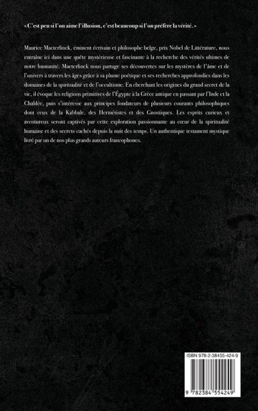 C'est peu si l'on aime l'illusion, c'est beaucoup si l'on préfère la vérité. Maurice Maeterlinck, éminent écrivain et philosophe belge, prix Nobel de Littérature, nous entraîne ici dans une quête mystérieuse et fascinante à la recherche des vérités ultimes de notre humanité. Maeterlinck nous partage ses découvertes sur les mystères de l'âme et de l'univers à travers les âges grâce à sa plume poétique et ses recherches approfondies dans les domaines de la spiritualité et de l'occultisme. En cherchant les origines du grand secret de la vie, il évoque les religions primitives de l'Égypte à la Grèce antique en passant par l'Inde et la Chaldée, puis s'intéresse aux principes fondateurs de plusieurs courants philosophiques dont ceux de la Kabbale, des Hermétistes et des Gnostiques. Les esprits curieux et aventureux seront captivés par cette exploration passionnante au c¿ur de la spiritualité humaine et des secrets cachés depuis la nuit des temps. Un authentique testament mystique livré par un de nos plus grands auteurs francophones.Extrait : Qu'on ne s'attende pas à trouver ici une histoire ou une monographie méthodique de l'occultisme. Il y faudrait consacrer des volumes que remplirait forcément une grande partie du fatras que je veux avant tout épargner au lecteur. Je n'ai d'autre dessein que de dire aussi simplement que possible ce que m'ont appris plusieurs années passées dans ces régions assez décriées et peu fréquentées. J'en rapporte les impressions d'un voyageur de bonne foi qui les a parcourues en curieux plutôt qu'en croyant. Ce sera, si l'on veut, une sorte de résumé ou de mise au point provisoire. Je ne sais rien de plus que ce que pourrait apprendre le premier venu qui ferait la même excursion. Je ne suis pas un initié, je n'ai pas eu de maîtres évanescents et mystérieux venus tout exprès des confins de ce monde ou d'un autre pour me révéler les dernières vérités et me défendre de les répéter. Je n'ai pas eu accès aux bibliothèques cachées, à ces sources secrètes de la suprême Sagesse qui, paraît-il, existent quelque part, mais seront toujours pour nous comme si elles n'étaient point, attendu qu'en y pénétrant on se condamne, sous peine de mort, à un silence inviolable. Je n'ai pas davantage déchiffré d'incompréhensibles grimoires ni découvert une clef nouvelle aux livres sacrés des grandes religions. J'ai seulement lu et étudié la majeure partie de ce qui a été écrit sur ces questions ; et parmi une masse énorme de documents absurdes, puérils, ressassés et inutiles, je ne me suis attaché qu'aux ¿uvres maîtresses qui ont vraiment à nous apprendre quelque chose que nous ne trouvons pas ailleurs. En déblayant ainsi les abords d'une étude trop souvent encombrée de débris rebutants, je faciliterai peut-être la tâche de ceux qui voudront et sauront aller plus loin que moi.