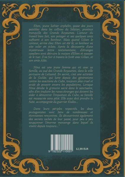 Elten, jeune luthier orphelin, passe des jours paisibles dans les collines du Sélatan, province tranquille des Grands Royaumes. L'amour du travail bien fait, son potager et ses quelques amis suffisent à son bonheur. Mais quand Gilian le conteur, arrive chez Elten cet été là, ce bonheur va vite voler en éclats. Après la découverte d'une mystérieuse lettre testamentaire, d'étranges cavaliers vont détruire la maison d'Elten et essayer de le tuer. Il va fuir à travers la forêt avec Gilian, et son amie Alda.