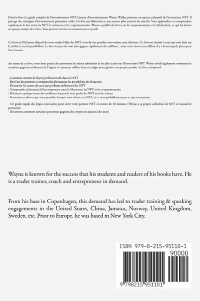 Dans le livre Le guide complet de l'investissement NFT, l'auteur d'investissements Wayne Walker présente un aperçu exhaustif de l'écosystème NFT. Il partage des stratégies d'investissement puissantes utiles à la fois aux débutants et aux acteurs plus avancés du marché. Vous apprendrez et comprendrez rapidement le lien entre les NFT, le métavers et les cryptomonnaies. Wayne a publié des livres sur les cryptomonnaies et la blockchain, ce qui lui donne un aperçu unique de ce lien. Vous pourrez mettre ces connaissances à profit. Ce livre n'a PAS pour objectif de vous vendre l'idée des NFT, vous devrez prendre vous-même cette décision. Ce livre est destiné à ceux qui sont fixés sur la réalité et sur les possibilités. Le but n'est pas de vous faire gagner rapidement des millions... mais entre zéro et un million, il y a beaucoup de place pour faire investir.. Au terme de ce livre, vous ferez partie des personnes les mieux informées et les plus à jour sur l'écosystème NFT. Wayne révèle également comment les membres gagnent réellement de l'argent et comment utiliser leurs stratégies pour générer vos propres profits. Le livre comprend : - Comment investir de façon professionnelle dans les NFT - Etre l'un des premiers à comprendre pleinement les possibilités du Metaverse - Découvrir les secrets de ceux qui profitent réellement des NFT - Comprendre clairement le lien important entre le Metaverse, les NFT et les cryptomonnaies - Découvrir quelques-unes des meilleures façons de tirer profit des NFT sans les acheter - Vous saurez enfin ce que vous possédez lorsque vous achetez un NFT, et ce n'est probablement pas ce que vous pensez - Un guide rapide des étapes nécessaires pour créer votre premier NFT en moins de 30 minutes (Wayne a sa propre collection de NFT et connaît le processus) - Découvrez comment certaines personnes gagnent des cryptos en jouant à des jeux!
