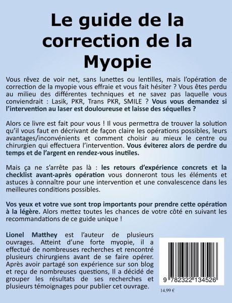 Vous rêvez de voir net, sans lunettes ou lentilles, mais l'opération de correction de la myopie vous effraie et vous fait hésiter ? Vous êtes perdu au milieu des différentes techniques et ne savez pas laquelle vous conviendrait : Lasik, PKR, Trans PKR, SMILE ? Vous vous demandez si l'intervention au laser est douloureuse et laisse des séquelles ? Alors ce livre est fait pour vous ! Il vous permettra de trouver la solution qu'il vous faut en décrivant de façon claire les opérations possibles, leurs avantages/inconvénients et comment choisir au mieux le centre ou chirurgien qui effectuera l'intervention. Tout ceci vous évitera de perdre du temps et de l'argent en rendez-vous inutiles.