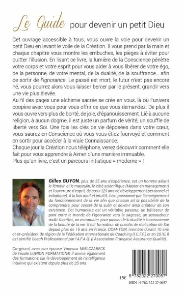 Cet ouvrage accessible à tous, vous ouvre la voie pour devenir un petit Dieu en levant le voile de la Création. Il vous prend par la main et chaque chapitre vous montre les embuches, les pièges à éviter pour quitter l'illusion. En lisant ce livre, la lumière de la Conscience pénètre votre corps et votre esprit pour vous aider à vous libérer de votre égo, de la personne, de votre mental, de la dualité, de la souffrance... afin de sortir de l#ignorance. Le passé est mort, le futur n#est pas encore né, vous pourrez alors vous laisser bercer par le présent, grandir vers une vie plus élevée.Au fil des pages une alchimie sacrée se crée en vous, là où l'univers coopère avec vous pour vous offrir ce que vous demandez. De plus il vous ouvre vers plus de bonté, de joie, d'épanouissement. Lié à aucune religion, à aucun dogme, il est juste un parfum de vérité, un souffle de liberté vers Soi. Une fois les clés de vie déposées dans votre coeur, vous saurez en Conscience où vous vous étiez fourvoyé et comment en sortir pour accéder à la vraie Connaissance.Chaque jour la Création nous téléphone, venez découvrir comment elle fait pour vous apprendre à Aimer d'une manière immuable.Plus qu'un livre, c'est un parcours initiatique « moderne » !