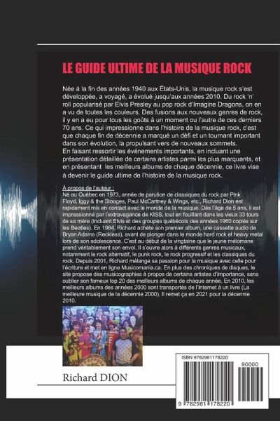 Née à la fin des années 1940 aux États-Unis, la musique rock s'est développée, a voyagé, a évolué jusqu'aux années 2010. Du rock 'n' roll popularisé par Elvis Presley au pop rock d'Imagine Dragons, on en a vu de toutes les couleurs. Des fusions aux nouveaux genres de rock, il y en a eu pour tous les goûts à un moment ou l'autre de ces derniers 70 ans. Ce qui impressionne dans l'histoire de la musique rock, c'est que chaque fin de décennie a marqué un défi et un tournant important dans son évolution, la propulsant vers de nouveaux sommets. En faisant ressortir les événements importants, en incluant une présentation détaillée de certains artistes parmi les plus marquants, et en présentant les meilleurs albums de chaque décennie, ce livre vise à devenir le guide ultime de l'histoire de la musique rock.