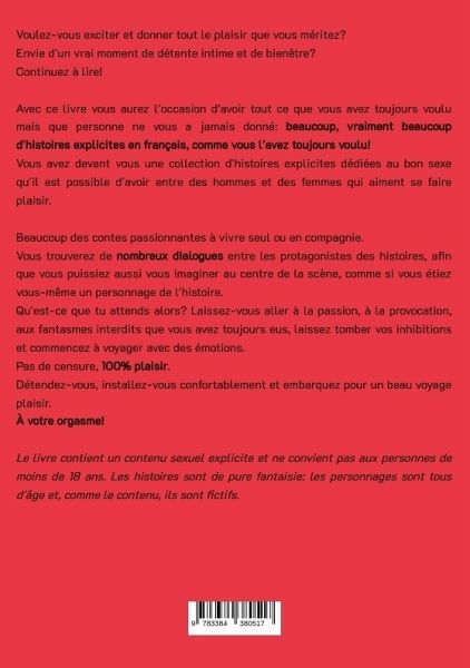 Voulez-vous exciter et donner tout le plaisir que vous méritez?Envie d'un vrai moment de détente intime et de bienêtre?Continuez à lire!Avec ce livre vous aurez l'occasion d'avoir tout ce que vous avez toujours voulu mais que personne ne vous a jamais donné: beaucoup, vraiment beaucoup d'histoires explicites en français, comme vous l'avez toujours voulu!Vous avez devant vous une collection d'histoires explicites dédiées au bon sexe qu'il est possible d'avoir entre des hommes et des femmes qui aiment se faire plaisir. Beaucoup des contes passionnantes à vivre seul ou en compagnie.Vous trouverez de nombreux dialogues entre les protagonistes des histoires, afin que vous puissiez aussi vous imaginer au centre de la scène, comme si vous étiez vous-même un personnage de l'histoire.Qu'est-ce que tu attends alors? Laissez-vous aller à la passion, à la provocation, aux fantasmes interdits que vous avez toujours eus, laissez tomber vos inhibitions et commencez à voyager avec des émotions.Pas de censure, 100 pour 100 de plaisir.Détendez-vous, installez-vous confortablement et embarquez pour un beau voyage plaisir.À votre orgasme!