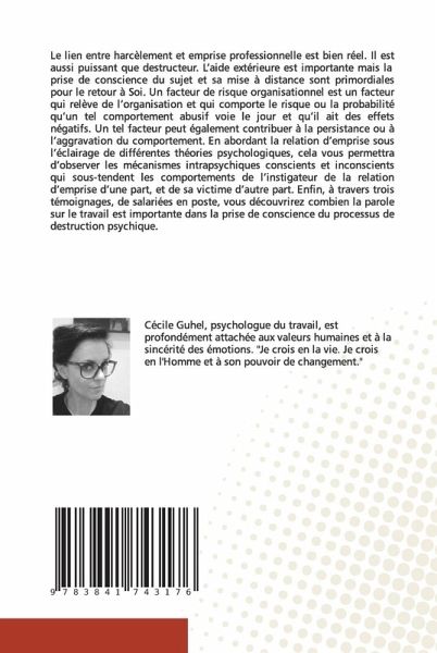 Le lien entre harcèlement et emprise professionnelle est bien réel. Il est aussi puissant que destructeur. L'aide extérieure est importante mais la prise de conscience du sujet et sa mise à distance sont primordiales pour le retour à Soi. Un facteur de risque organisationnel est un facteur qui relève de l'organisation et qui comporte le risque ou la probabilité qu'un tel comportement abusif voie le jour et qu'il ait des effets négatifs. Un tel facteur peut également contribuer à la persistance ou à l'aggravation du comportement. En abordant la relation d'emprise sous l'éclairage de différentes théories psychologiques, cela vous permettra d'observer les mécanismes intrapsychiques conscients et inconscients qui sous-tendent les comportements de l'instigateur de la relation d'emprise d'une part, et de sa victime d'autre part. Enfin, à travers trois témoignages, de salariées en poste, vous découvrirez combien la parole sur le travail est importante dans la prise de conscience du processus de destruction psychique.