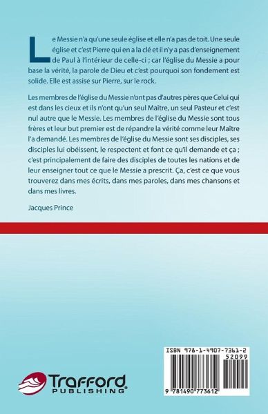 L e Messie n'a qu'une seule église et elle n'a pas de toit. Une seule église et c'est Pierre qui en a la clé et il n'y a pas d'enseignement de Paul à l'intérieur de celle-ci ; car l'église du Messie a pour base la vérité, la parole de Dieu et c'est pourquoi son fondement est solide. Elle est assise sur Pierre, sur le rock. Les membres de l'église du Messie n'ont pas d'autres pères que Celui qui est dans les cieux et ils n'ont qu'un seul Maître, un seul Pasteur et c'est nul autre que le Messie. Les membres de l'église du Messie sont tous frères et leur but premier est de répandre la vérité comme leur Maître l'a demandé. Les membres de l'église du Messie sont ses disciples, ses disciples lui obéissent, le respectent et font ce qu'il demande et ça ; c'est principalement de faire des disciples de toutes les nations et de leur enseigner tout ce que le Messie a prescrit. Ça, c'est ce que vous trouverez dans mes écrits, dans mes paroles, dans mes chansons et dans mes livres. Jacques Prince