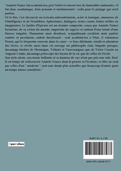 "Anatole France fut académicien, prix Nobel et enterré lors de funérailles nationales ; il fut donc académique, bien pensant et institutionnel : voilà pour le préjugé qui sévit parfois. Or le lire, c'est découvrir un écrivain anticonformiste, acéré et ironique, amoureux de l'intelligence et de l'érudition. Aphorismes, dialogues, textes courts, lettres réelles ou imaginaires, Le Jardin d'Epicure est un résumé composite, conçu par Anatole France lui-même, de sa vision du monde, empreinte de sagesse et surtout d'une ironie d'une finesse inégalée. Humaniste mais désabusé, sympathisant socialiste mais parfois sombre et pessimiste, ardent dreyfusard - seul académicien à l'être, il entraînera Proust, qui le fréquenta souvent, dans la cause - ce faux dilettante, érudit et adorateur des livres, se révèle aussi dans cet ouvrage un philosophe clair, limpide presque, davantage héritier de Montaigne, Voltaire et Vauvenargues que de Victor Cousin ou Auguste Comte, davantage préoccupé des leçons de la vie que de celles de l'école. Son style alerte, son ironie brillante et sa hauteur de vue n'ont pas pris une ride. Bref, il est temps de redécouvrir Anatole France dont la pensée et l'écriture, si elles ne sont pas celles d'un " moderne " sont sans doute plus actuelles que beaucoup d'autres pour un temps mieux considérés."