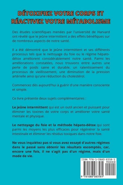 *Nouvelle édition 2023, livre mis à jour en décembre 2022 - Plus de 5000 exemplaires vendus*Vous avez déjà essayé une multitude de régimes sans jamais réussir à perdre du poids, ou, pire encore, vous avez tendance à reprendre plus de poids que vous n'en perdez lorsque vous arrêtez un régime ? Si vous voulez apprendre comment perdre du poids et retrouver la santé en détoxifiant votre corps, lisez la suite. Des études scientifiques menées par l'université de Harvard ont révélé que le jeûne intermittent a des effets bénéfiques sur de nombreux aspects de notre santé. Il a été démontré que le jeûne intermittent et ses différents processus tels que le nettoyage du foie ou la méthode hépato-détox améliorent considérablement notre santé. Parmi les améliorations constatées, citons la perte de poids saine et durable, le ralentissement du processus de vieillissement, une baisse de la pression artérielle ainsi qu'une réduction du taux de cholestérol, entre autres. Vous pouvez commencer à guérir dès aujourd'hui de manière consciente et simple. Ce livre présente deux sujets essentiels et complémentaires : Le jeûne intermittent, qui est un concept ancien et puissant pour éliminer les toxines de votre corps et améliorer votre santé mentale et physique. Le nettoyage du foie et la méthode hépato-détox, qui sont parmi les moyens les plus efficaces pour régénérer la santé intestinale et éliminer les résidus toxiques dans le foie. Le simple fait de comprendre et d'appliquer ces méthodes vous permettra de perdre du poids en quelques jours, d'augmenter votre niveau d'énergie et de retrouver une bonne santé générale, tout cela de manière naturelle. Voici un avant-goût de ce que vous allez découvrir dans ce livre : Des explications claires pour mieux comprendre le jeûne intermittent Les différents types de jeûne et comment les pratiquer Ce qui se passe dans votre corps pendant le jeûne Pourquoi les experts recommandent le jeûne intermittent Le rôle essentiel du nettoyage du foie dans le jeûne intermittent Comment faire un nettoyage intestinal et un nettoyage du foie Comment traiter les pathologies douloureuses telles que les calculs biliaires Un menu d'une semaine pour commencer le jeûne intermittent et le nettoyage du foie Ne vous inquiétez pas si vous avez essayé d'autres régimes par le passé sans obtenir les résultats escomptés : le jeûne intermittent n'est pas un régime, c'est un mode de vie. Faites défiler la page vers le haut et cliquez sur "Acheter maintenant" pour offrir une nouvelle vie à votre corps.