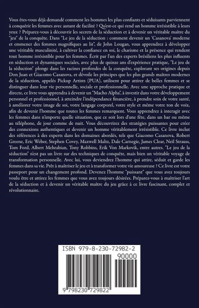 Vous êtes-vous déjà demandé comment les hommes les plus confiants et séduisants parviennent à conquérir les femmes avec autant de facilité ? Qu'est-ce qui rend un homme irrésistible à leurs yeux ? Préparez-vous à découvrir les secrets de la séduction et à devenir un véritable maître du "jeu" de la conquête. Dans "Le jeu de la séduction : comment devenir un 'Casanova' moderne et emmener des femmes magnifiques au lit", de John Lougan, vous apprendrez à développer une véritable masculinité, à cultiver la confiance en soi, le charisme et la présence qui rendent tout homme irrésistible pour les femmes. Écrit par l'un des experts brésiliens les plus influents en séduction et dynamiques sociales, avec plus de quinze ans d'expérience pratique, "Le jeu de la séduction" plonge dans les racines profondes de la conquête, explorant ses origines depuis Don Juan et Giacomo Casanova, et dévoile les principes que les plus grands maîtres modernes de la séduction, appelés Pickup Artists (PUA), utilisent pour attirer de belles femmes et se distinguer dans leur vie personnelle, sociale et professionnelle. Avec une approche pratique et directe, ce livre vous apprendra à devenir un "Macho Alpha", à investir dans votre développement personnel et professionnel, à atteindre l'indépendance financière, à prendre soin de votre santé, à améliorer votre image de soi, votre langage corporel, votre style et même votre ton de voix, afin de devenir l'homme que toutes les femmes remarquent. Vous apprendrez à interagir avec les femmes dans n'importe quelle situation, que ce soit lors d'une fête, dans un bar ou même au téléphone, de jour comme de nuit. Vous découvrirez des stratégies puissantes pour créer des connexions authentiques et devenir un homme véritablement irrésistible. Ce livre inclut des références à des experts dans les domaines abordés, tels que Giacomo Casanova, Robert Greene, Eric Weber, Stephen Covey, Maxwell Maltz, Dale Carnegie, James Clear, Neil Strauss, Tom Ford, Albert Mehrabian, Tony Robbins, Erik Von Markovik, entre autres. "Le jeu de la séduction" n'est pas un livre sur des techniques de conquête, mais bien un véritable voyage de transformation personnelle. Avec lui, vous deviendrez l'homme qui attire, séduit et garde les femmes dans sa vie. Prêt à maîtriser le jeu et à transformer votre vie amoureuse ? Ce livre est votre passeport pour un changement profond. Devenez l'homme "puissant" que vous avez toujours voulu être et attirez les femmes que vous avez toujours désirées. Préparez-vous à maîtriser l'art de la séduction et à devenir un véritable maître du jeu grâce à ce livre fascinant, complet et révolutionnaire.