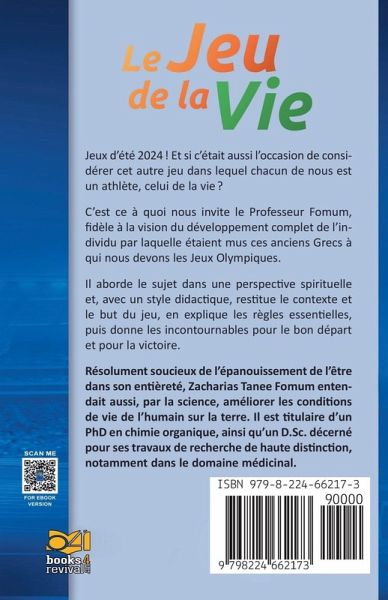 Jeux d'été 2024¿! Et si c'était aussi l'occasion de considérer cet autre jeu dans lequel chacun de nous est un athlète, celui de la vie¿? C'est ce à quoi nous invite le Professeur Fomum, fidèle à la vision du développement complet de l'individu par laquelle étaient mus ces anciens Grecs à qui nous devons les Jeux Olympiques. Il aborde le sujet dans une perspective spirituelle et, avec un style didactique, restitue le contexte et le but du jeu, en explique les règles essentielles, puis donne les incontournables pour le bon départ et pour la victoire. Résolument soucieux de l'épanouissement de l'être dans son entièreté, Zacharias Tanee Fomum entendait aussi, par la science, améliorer les conditions de vie de l'humain sur la terre. Il est titulaire d'un PhD en chimie organique, ainsi qu'un D.Sc. décerné pour ses travaux de recherche de haute distinction, notamment dans le domaine médicinal.