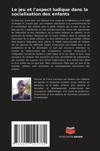 Ce livre est, d'une part, une réponse à la rareté de la littérature sur le sujet en Angola et, d'autre part, une modeste contribution à la compréhension de la socialisation des enfants dans la petite enfance, par le biais du jeu. En tant que tel, il représente un outil précieux entre les mains des spécialistes de l'éducation et des éducateurs de la petite enfance en général, et en particulier du lecteur intéressé par un avenir meilleur, dans le contexte de l'éducation de la petite enfance. Ce livre démontre les possibilités infinies dont dispose l'éducateur pour utiliser la réalité socioculturelle de l'enfant, afin de valoriser les différents modes d'interaction qu'il établit dans sa vie quotidienne et de les développer en tant que ressource didactique au service du renforcement des compétences sociales nécessaires à l'intégration sociale de l'enfant à cette étape de la vie. Dans ce livre, nous essayons de soulever des questions qui nous permettront de comprendre, par exemple, les nuances d'un enfant hypermature, d'un enfant bien élevé et d'un enfant qui ne joue pas. Nous renforçons l'idée que les jeux et les activités ludiques sont essentiels au développement harmonieux des enfants.