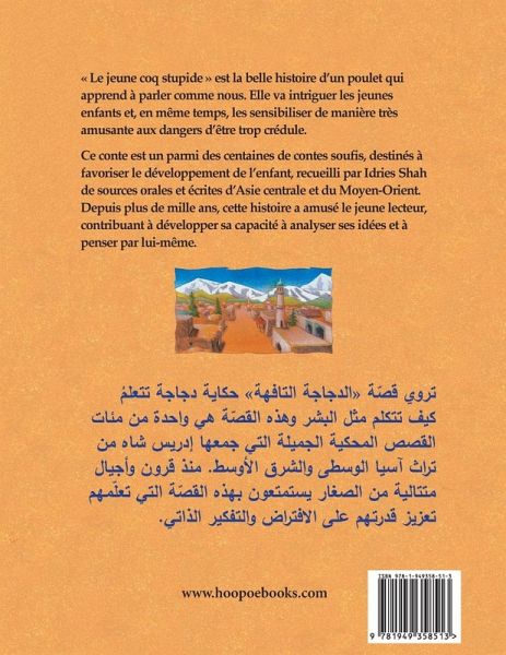 (Edition bilingue français-arabe) C'est une histoire délicieuse et humoristique sur un poulet qui apprend à parler comme nous... avec des conséquences inattendues. Les événements surprenants qui suivent intriguent les petits et en même temps, les alertent de façon très amusante sur les dangers d'être trop prompt à croire tout ce qu'ils entendent. L'illustrateur Jeff Jackson crée un monde vivant et léger, riche en couleurs et en expressions, dans lequel tout peut arriver. Ce conte est l'une des centaines d'histoires développementales soufies recueillies par Idries Shah à partir de sources orales et écrites en Asie centrale et au Moyen-Orient. Depuis plus de mille ans, il divertit les jeunes et les aide à développer chez eux la capacité d'examiner leurs suppositions et de penser par eux-mêmes.