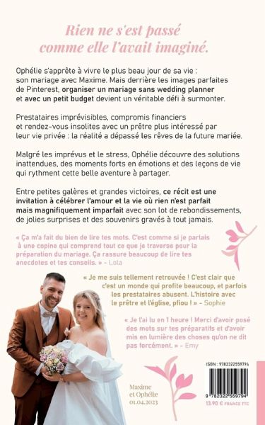 Rien ne s'est passé comme elle l'avait imaginé. Ophélie s'apprête à vivre le plus beau jour de sa vie : son mariage avec Maxime. Mais derrière les images parfaites de Pinterest, organiser un mariage sans wedding planner et avec un petit budget devient un véritable défi à surmonter. Prestataires imprévisibles, compromis financiers et rendez-vous insolites avec un prêtre plus intéressé par leur vie privée : la réalité à dépassé les rêves de la future mariée. Malgré les imprévus et le stress, Ophélie découvre des solutions inattendues, des moments forts en émotions et des leçons de vie qui rythment cette belle aventure à partager. Entre petites galères et grandes victoires, ce récit est une invitation à célébrer l'amour et la vie où rien n'est parfait mais magnifiquement imparfait avec son lot de rebondissements, de jolies surprises et des souvenirs gravés à tout jamais. "ça m'a fait du bien de lire tes mots. C'est comme si je parlais à une copine qui comprend tout ce que je traverse pour la préparation du mariage. C'est rassurant de lire tes anecdotes et tes conseils." - Lola "je me suis tellement retrouvée ! C'est clair que c'est un monde qui profite beaucoup et parfois les prestataires abusent. L'histoire avec le prêtre et l'église, pfiou ! On voit l'amour entre vous et c'est très beau." - Jade "je l'ai lu en une heure ! Merci d'avoir posé des mots sur tes préparatifs et d'avoir mis en lumière des choses qu'on ne dit pas forcément." - Emy Un témoignage authentique qui révèle les secrets et les coulisses de l'organisation de mariage moderne vécue par les futurs mariés : loin des clichés ! A lire avant de se marier ou simplement pour s'évader.