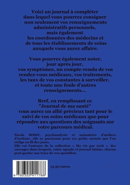 Voici un journal à compléter dans lequel vous pourrez consigner non seulement vos renseignements administratifs personnels, mais également les coordonnées des médecins et de tous les établissements de soins auxquels vous aurez affaire. Vous pourrez également noter, jour après jour, vos symptômes, un compte-rendu de vos rendez-vous médicaux, vos traitements, les taux de vos constantes à surveiller, et toute une foule d'autres renseignements... Bref, en remplissant ce "Journal de ma santé" vous aurez un allié précieux tant pour le suivi de vos soins médicaux que pour répondre aux questions des soignants sur votre parcours médical.