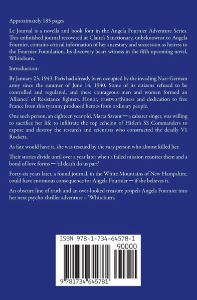 Approximately 185 pages Le Journal is a novella and book four in the Angela Fournier Adventure Series. This unfinished journal recovered at Claire's Sanctionary, unbeknownst to Angela Fournier, contains critical information of her ancestary and succession as heiress to the Fournier Foundation. Its discovery bears witness in the fifth upcoming novel, Whiteburn. Introduction: By January 23, 1943, Paris had already been occupied by the invading Nazi-German army since the summer of June 14, 1940. Some of its citizens refused to be controlled and regulated, and these courageous men and women formed an 'Alliance' of Résistance fighters. Honor, trustworthiness and dedication to free France from this tyranny produced heroes from ordinary people. One such person, an eighteen year old, Marta Savant ─ a cabaret singer, was willing to sacrifice her life to infiltrate the top echelon of Hitler's SS Commanders to expose and destroy the research and scientists who constructed the deadly V1 Rockets. As fate would have it, she was rescued by the vary person who almost killed her. Their stories divide until over a year later when a failed mission reunites them and a bond of love forms ─ 'til death do us part'. Forty-six years later, a found journal, in the White Mountains of New Hampshire, could have enormous consequence for Angela Fournier ─ if she believes it. An obscure line of truth and an over-looked treasure propels Angela Fournier into her next psycho-thriller adventure - 'Whiteburn'.