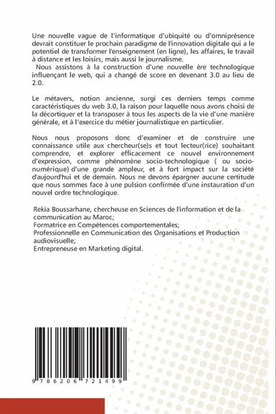 Une nouvelle vague de l'informatique d'ubiquité ou d'omniprésence devrait constituer le prochain paradigme de l'innovation digitale qui a le potentiel de transformer l'enseignement (en ligne), les affaires, le travail à distance et les loisirs, mais aussi le journalisme. Nous assistons à la construction d'une nouvelle ère technologique influençant le web, qui a changé de score en devenant 3.0 au lieu de 2.0. Le métavers, notion ancienne, surgi ces derniers temps comme caractéristiques du web 3.0, la raison pour laquelle nous avons choisi de la décortiquer et la transposer à tous les aspects de la vie d'une manière générale, et à l'exercice du métier journalistique en particulier. Nous nous proposons donc d'examiner et de construire une connaissance utile aux chercheur(se)s et tout lecteur(rice) souhaitant comprendre, et explorer efficacement ce nouvel environnement d'expression, comme phénomène socio-technologique ( ou socio-numérique) d'une grande ampleur, et à fort impact sur la société d'aujourd'hui et de demain. Nous ne devons épargner aucune certitude que nous sommes face à une pulsion confirmée d'une instauration d'un nouvel ordre technologique.
