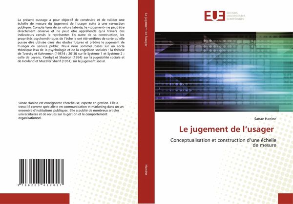 La présent ouvrage a pour objectif de construire et de valider une échelle de mesure du jugement de l'usager suite à une servuction publique. Compte tenu de sa nature latente, le «jugement» ne peut être directement observé et ne peut être appréhendé qu'à travers des indicateurs censés le représenter. En outre de sa construction, les propriétés psychométriques de l'échelle ont été vérifiées de sorte qu'elle puisse être utilisée dans des études futures et prédire le jugement de l'usager du service public. Nous nous sommes basés sur un socle théorique issu de la psychologie et de la cognition sociales : la théorie de Tversky et Kahneman (19874 ; 2010) sur le Système 1 et Système 2 ; celle de Leyens, Yzerbyt et Shadron (1994) sur la jugeabilité sociale et de Hovland et Muzafer Sherif (1961) sur le jugement social.