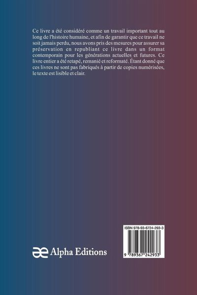 Le juif errant - Tome II" est un livre classique, qui a eu une valeur significative tout au long de l'histoire, et pour garantir que sa sagesse intemporelle ne soit jamais perdue, Alpha Editions l'a soigneusement préservé en le republiant dans un format moderne et accessible aux générations présentes et futures. Soigneusement reformaté, retapé , et nouvellement conçue, cette édition offre un texte clair et lisible, sans copies numérisées de l'uvre originale, Alpha Editions se consacre à insuffler une nouvelle vie aux livres anciens et classiques, rendant ces trésors littéraires à nouveau disponibles pour les lecteurs qui chérissent l'histoire. culture et savoir intemporel.