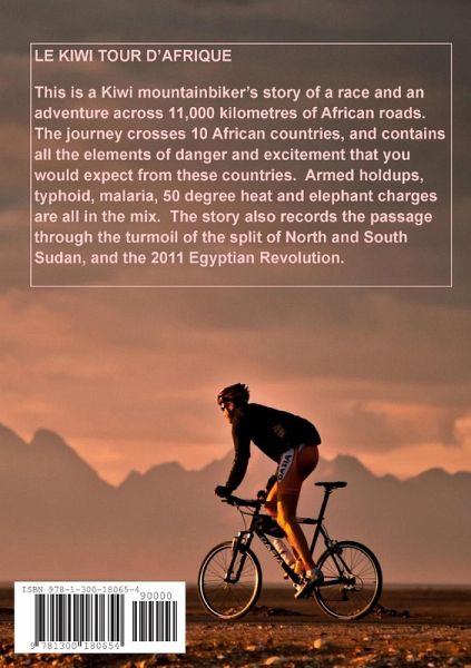 This is a Kiwi mountainbiker's story of a race and an adventure across 11,000 kilometres of African roads. The journey crosses 10 African countries, and contains all the elements of danger and excitement that you would expect from these countries. Armed holdups, typhoid, malaria, 50 degree heat and elephant charges are all in the mix. The story also records the passage through the turmoil of the split of North and South Sudan, and the 2011 Egyptian Revolution.