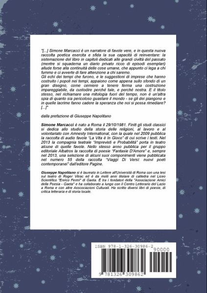 Simone Marcacci è un narratore di favole vere, e in questa nuova raccolta poetica esercita e sfida la sua capacità di reinventare: la sistemazione del libro in capitoli dedicati alle grandi civiltà del passato (mentre si squaderna un diario privato ricco di episodi esemplari) allude forse alla continuità delle cose umane, che appunto ci lega a chi fummo e ci avverte di fare attenzione a chi saremo. Gli echi dei tempi che furono, e le suggestioni di imprese che hanno costruito i popoli nei tempi, appaiono come appena sullo sfondo di un gran disegno, come cerniere a tenere ferma una costruzione impareggiabile, da custodire perché tale, e perché nostra. E il titolo stesso, nel richiamare una mitologia fuori del tempo, non è un'altra spia di quanto sia pericoloso guastare il mondo - se gli dei piangono e in quelle lacrime fanno cadere la speranza che noi si possa rimediare?