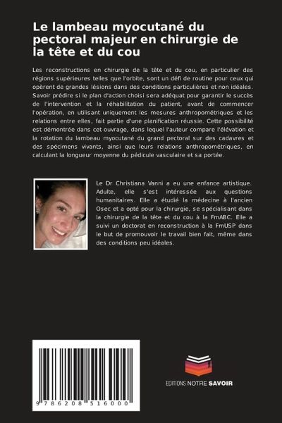 Les reconstructions en chirurgie de la tête et du cou, en particulier des régions supérieures telles que l'orbite, sont un défi de routine pour ceux qui opèrent de grandes lésions dans des conditions particulières et non idéales. Savoir prédire si le plan d'action choisi sera adéquat pour garantir le succès de l'intervention et la réhabilitation du patient, avant de commencer l'opération, en utilisant uniquement les mesures anthropométriques et les relations entre elles, fait partie d'une planification réussie. Cette possibilité est démontrée dans cet ouvrage, dans lequel l'auteur compare l'élévation et la rotation du lambeau myocutané du grand pectoral sur des cadavres et des spécimens vivants, ainsi que leurs relations anthropométriques, en calculant la longueur moyenne du pédicule vasculaire et sa portée.