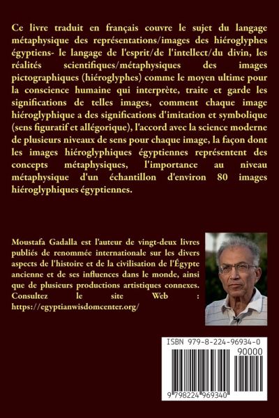 Réalités scientifiques/métaphysiques des images illustrées (Hiéroglyphes) comme moyens ultimes pour la conscience humaine qui interprètent, traitent et conservent les significations de ces images. Ce livre comprend 8 chapitres. Le chapitre 1: La duperie historique sur la linguistique de l'ancienne Égypte entend mettre fin à la confusion qui déforme les hiéroglyphes égyptiens en les présentant comme une forme primitive d'écriture composée de valeurs de sons individuels. Les hiéroglyphes égyptiens sont des idéogrammes qui n'ont rien à voir avec le système alphabétique égyptien. Le chapitre 2: Les réalités scientifiques/métaphysiques des images illustrées (hiéroglyphes) explique comment les êtres humains traitent les informations reçues par les cinq sens et transmises au cerveau via des images représentées ; comment chaque image hiéroglyphique possède un sens imitatif et symbolique (figuratif et allégorique) ; il aborde également la concurrence dans la science moderne de cette multitude de sens pour chaque image et démontre qu'une série d'images est traitée de la même manière par la conscience qu'un rêve. Le chapitre 3: La représentation des pensées avec les images hiéroglyphiques égyptiennes explique comment les images hiéroglyphiques égyptiennes représentent des concepts métaphysiques ; il traite également des relations entre leurs fonctions et leurs formes géométriques et fournit un aperçu de la formation égyptienne de ces idéogrammes. Le chapitre 4: Les images hiéroglyphiques d'animaux explique le sens métaphysique de ces images et souligne l'importance d'une trentaine d'images hiéroglyphiques égyptiennes. Le chapitre 5: Les images hiéroglyphiques d'humains et d'humains à tête d'animal explique le sens métaphysique de ces images et souligne la portée d'une dizaine d'images hiéroglyphiques égyptiennes. Le chapitre 6: Les images hiéroglyphiques des parties du corps explique le sens métaphysique de ces images et souligne la portée d'une dizaine d'images hiéroglyphiques égyptiennes. Le chapitre 7: Les images hiéroglyphiques de la nature et de figures géométriques explique le sens métaphysique de ces images et souligne la portée d'une dizaine d'images hiéroglyphiques égyptiennes. Le chapitre 8: Images hiéroglyphiques d'objets faits par l'homme explique le sens métaphysique de ces images et souligne la portée d'une vingtaine d'images hiéroglyphiques égyptiennes.