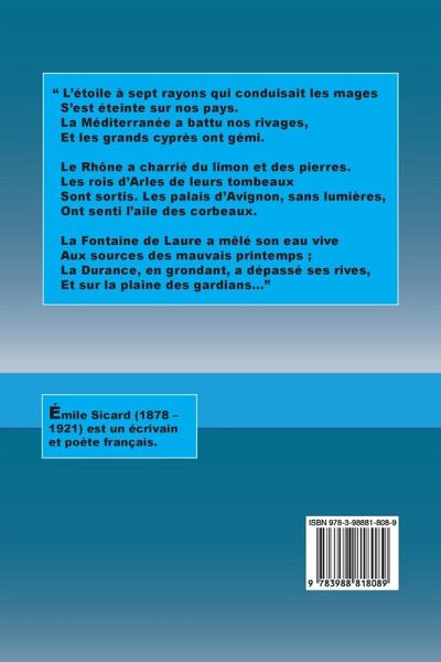 " L'étoile à sept rayons qui conduisait les mages S'est éteinte sur nos pays. La Méditerranée a battu nos rivages, Et les grands cyprès ont gémi. Le Rhône a charrié du limon et des pierres. Les rois d'Arles de leurs tombeaux Sont sortis. Les palais d'Avignon, sans lumières, Ont senti l'aile des corbeaux. La Fontaine de Laure a mêlé son eau vive Aux sources des mauvais printemps ; La Durance, en grondant, a dépassé ses rives, Et sur la plaine des gardians..."