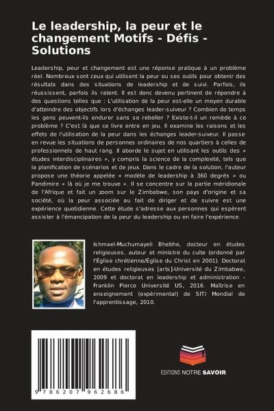 Leadership, peur et changement est une réponse pratique à un problème réel. Nombreux sont ceux qui utilisent la peur ou ses outils pour obtenir des résultats dans des situations de leadership et de suivi. Parfois, ils réussissent, parfois ils ratent. Il est donc devenu pertinent de répondre à des questions telles que : L'utilisation de la peur est-elle un moyen durable d'atteindre des objectifs lors d'échanges leader-suiveur ? Combien de temps les gens peuvent-ils endurer sans se rebeller ? Existe-t-il un remède à ce problème ? C'est là que ce livre entre en jeu. Il examine les raisons et les effets de l'utilisation de la peur dans les échanges leader-suiveur. Il passe en revue les situations de personnes ordinaires de nos quartiers à celles de professionnels de haut rang. Il aborde le sujet en utilisant les outils des « études interdisciplinaires », y compris la science de la complexité, tels que la planification de scénarios et de jeux. Dans le cadre de la solution, l'auteur propose une théorie appelée « modèle de leadership à 360 degrés » ou Pandimire « là où je me trouve ». Il se concentre sur la partie méridionale de l'Afrique et fait un zoom sur le Zimbabwe, son pays d'origine et sa société, où la peur associée au fait de diriger et de suivre est une expérience quotidienne. Cette étude s'adresse aux personnes qui espèrent assister à l'émancipation de la peur du leadership ou en faire l'expérience.